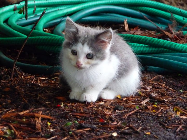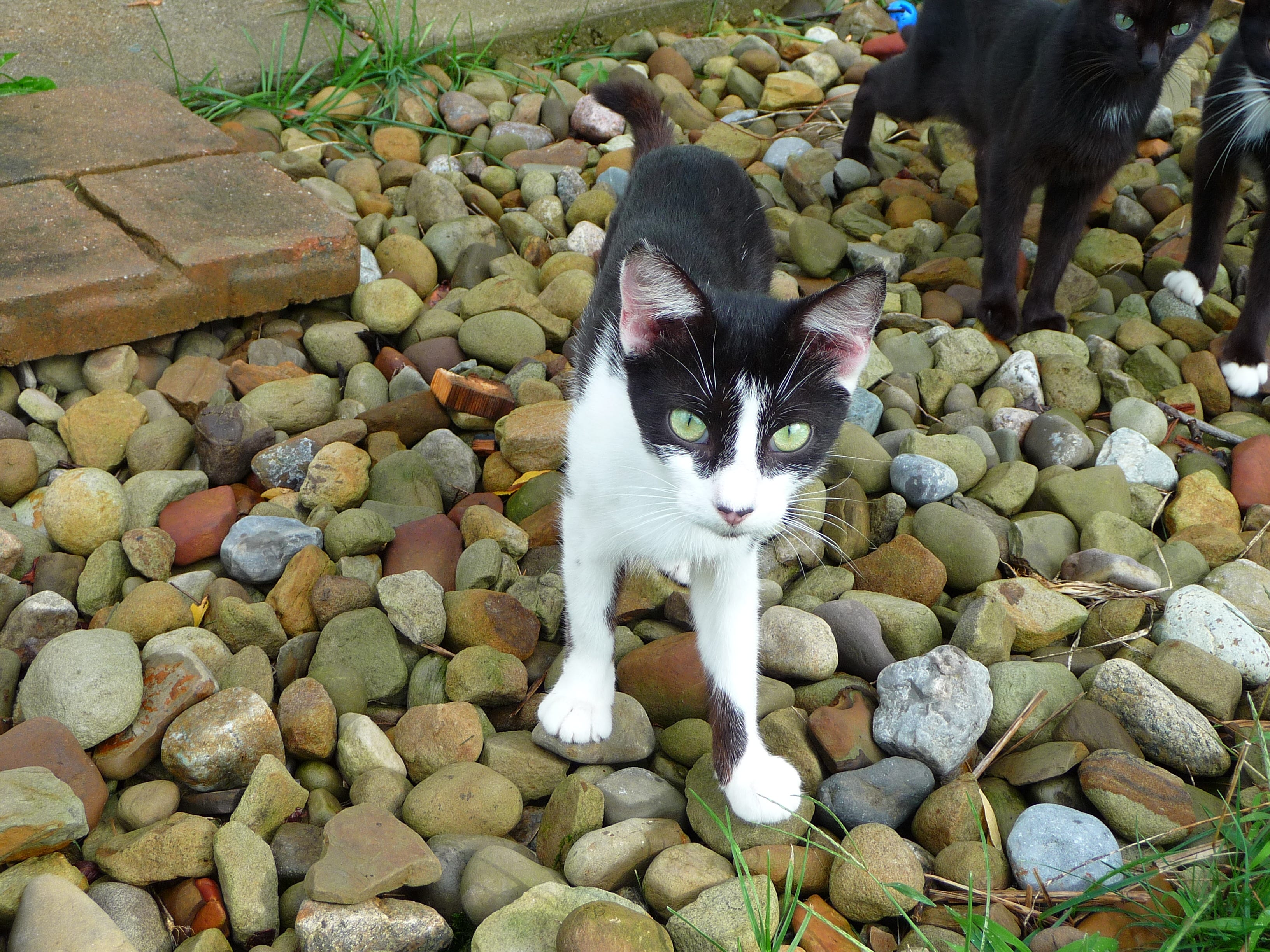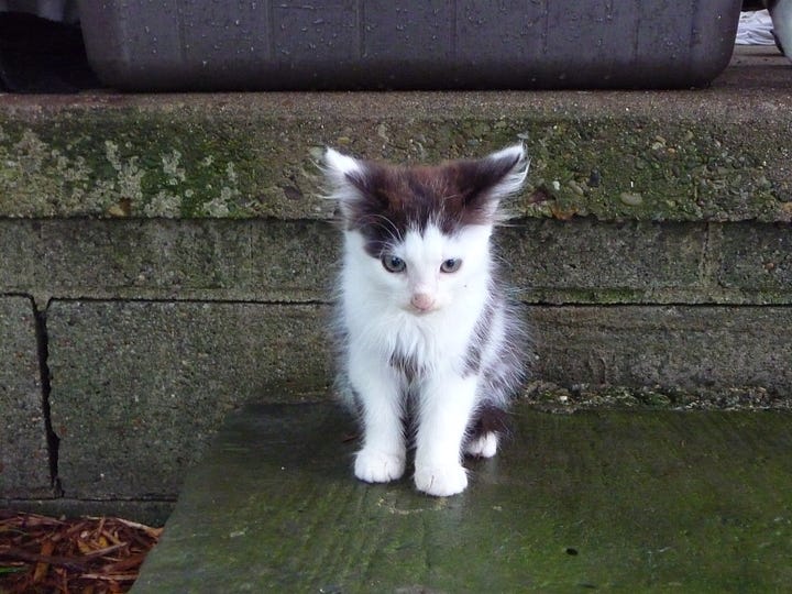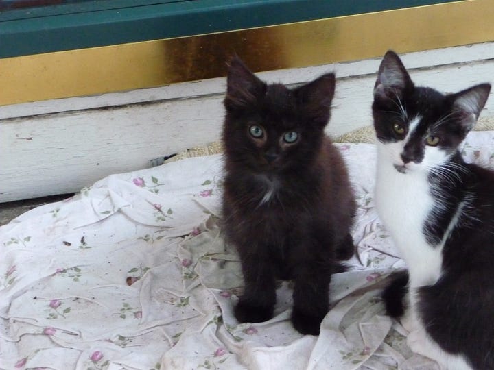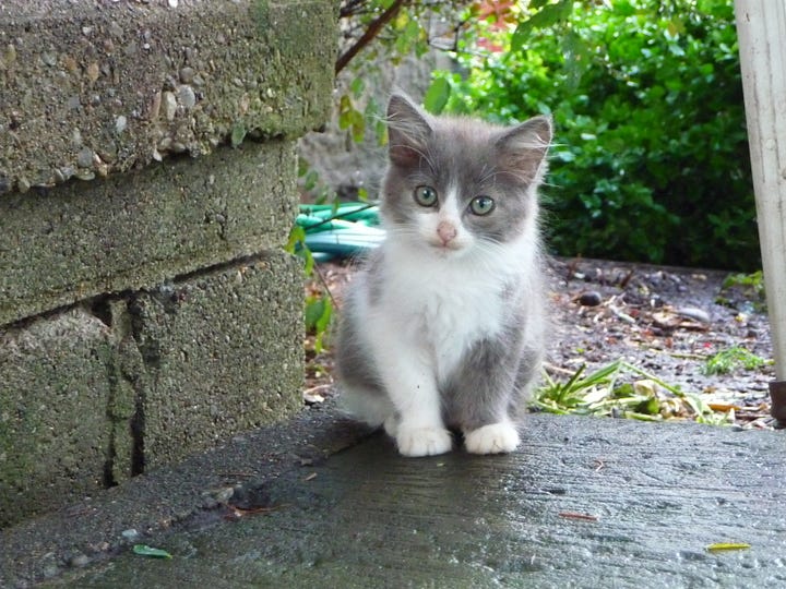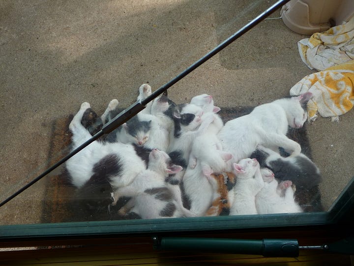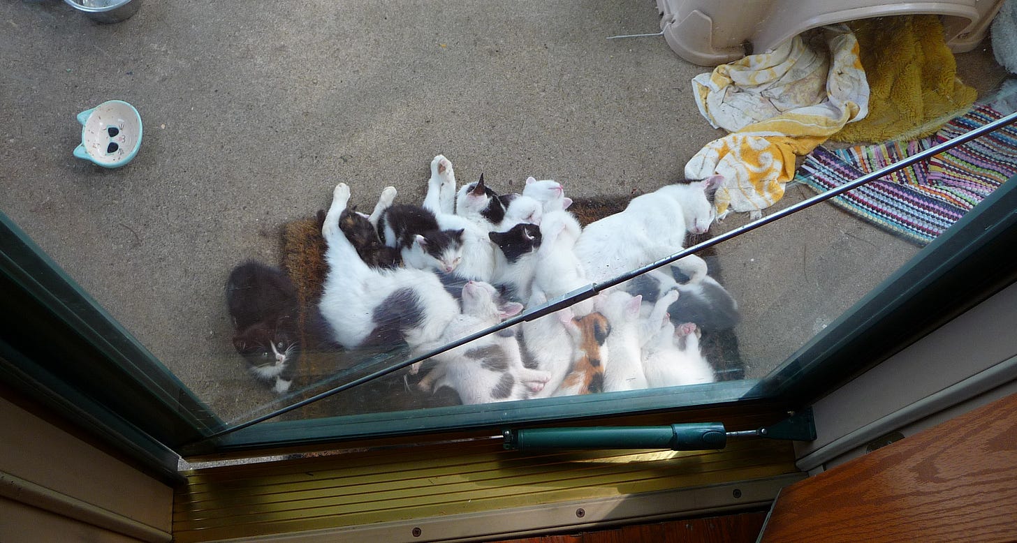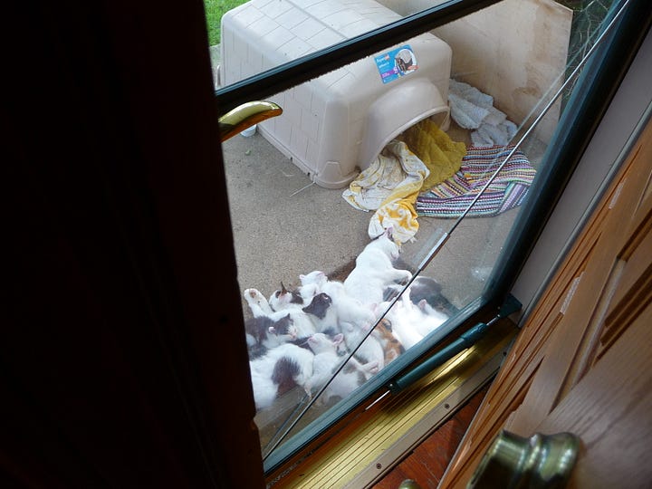 In short, in the early morning hours, we were invaded—permanently. In the distance, we could see some more of the mother cats carefully leading more little ones to the Promised Land, and they soon arrived on our doorstep as well.