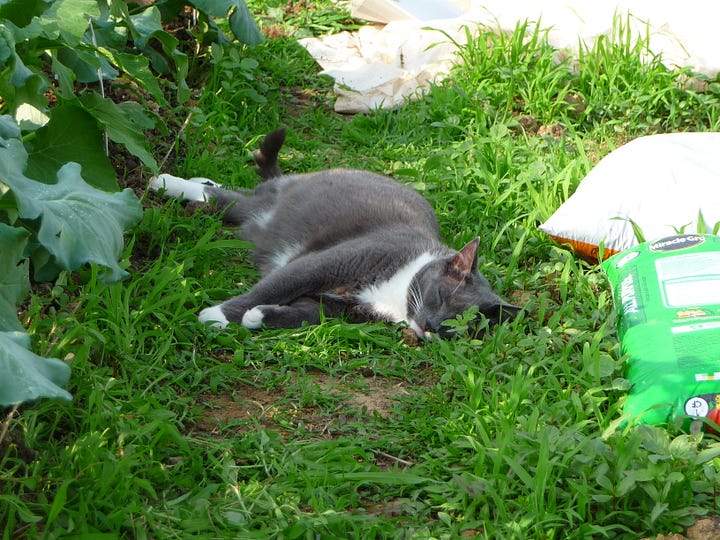 I’m sure it did, although I don’t remember it. But I do know that there was no thunderstorm, nor wind, nor rain and not much going on at our place except gardening. We were in our second year of planting for a small market garden (with a lot of help from our cat Thomas).